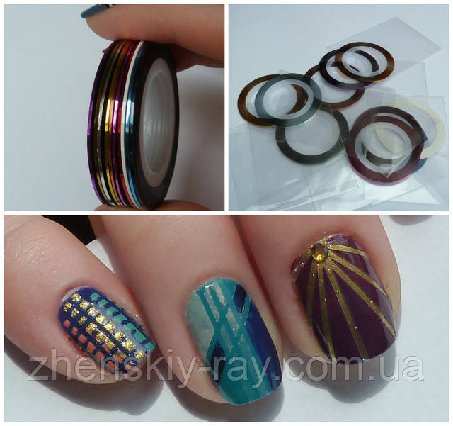 • Декоративні стрічки — це чудове рішення для швидкого та простого дизайну нігтів. Стрічка представлена в різних колірних рішеннях — золото, срібло, кольорова. Можливе її використання під акрил, гель або просто під два шари закріплювача. З дизайном із цієї стрічки впорається навіть дитина!